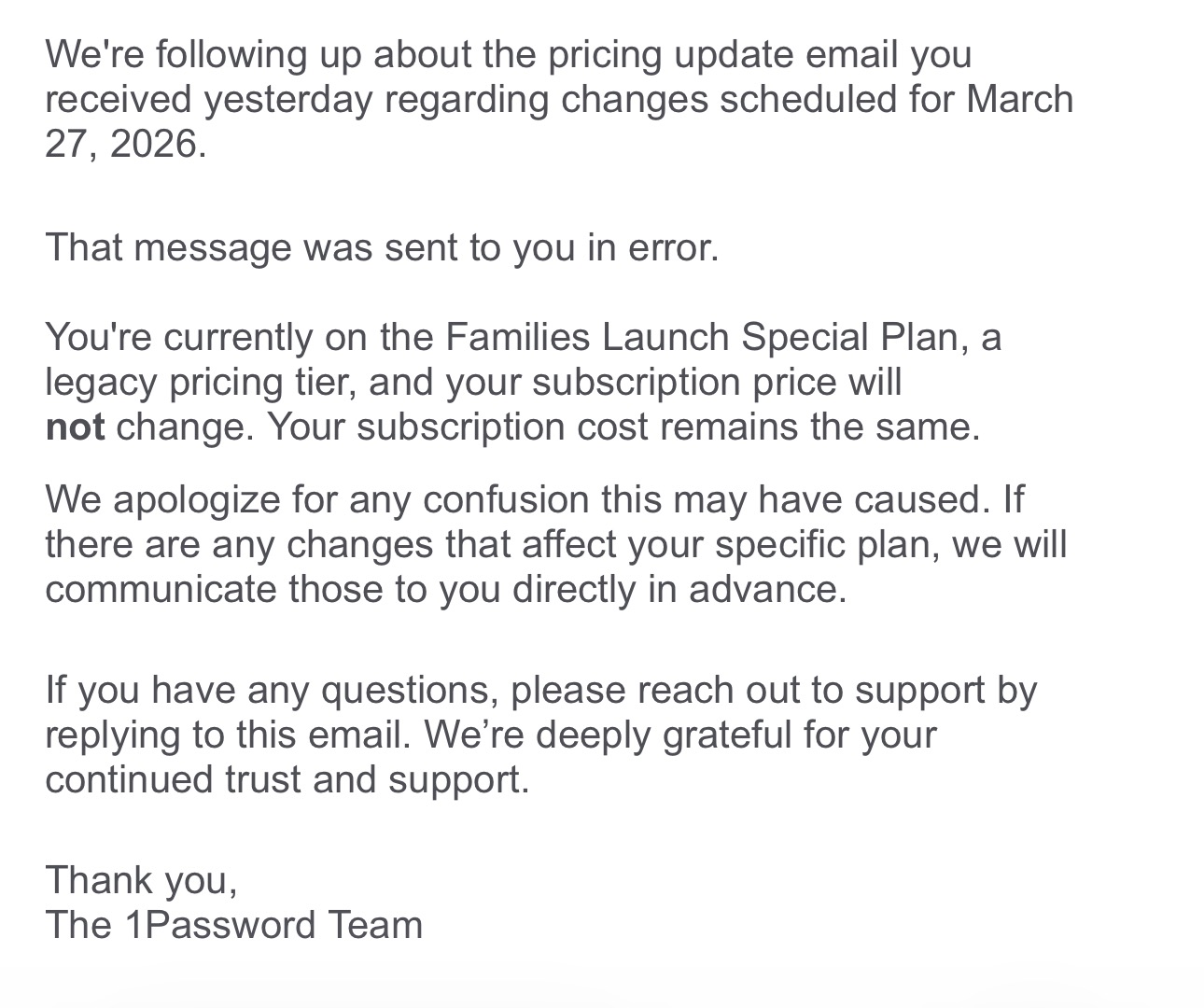 I just received an email from 1Password. I also have the legacy Families Launch Special Plan. The cost of that plan will not be increasing.