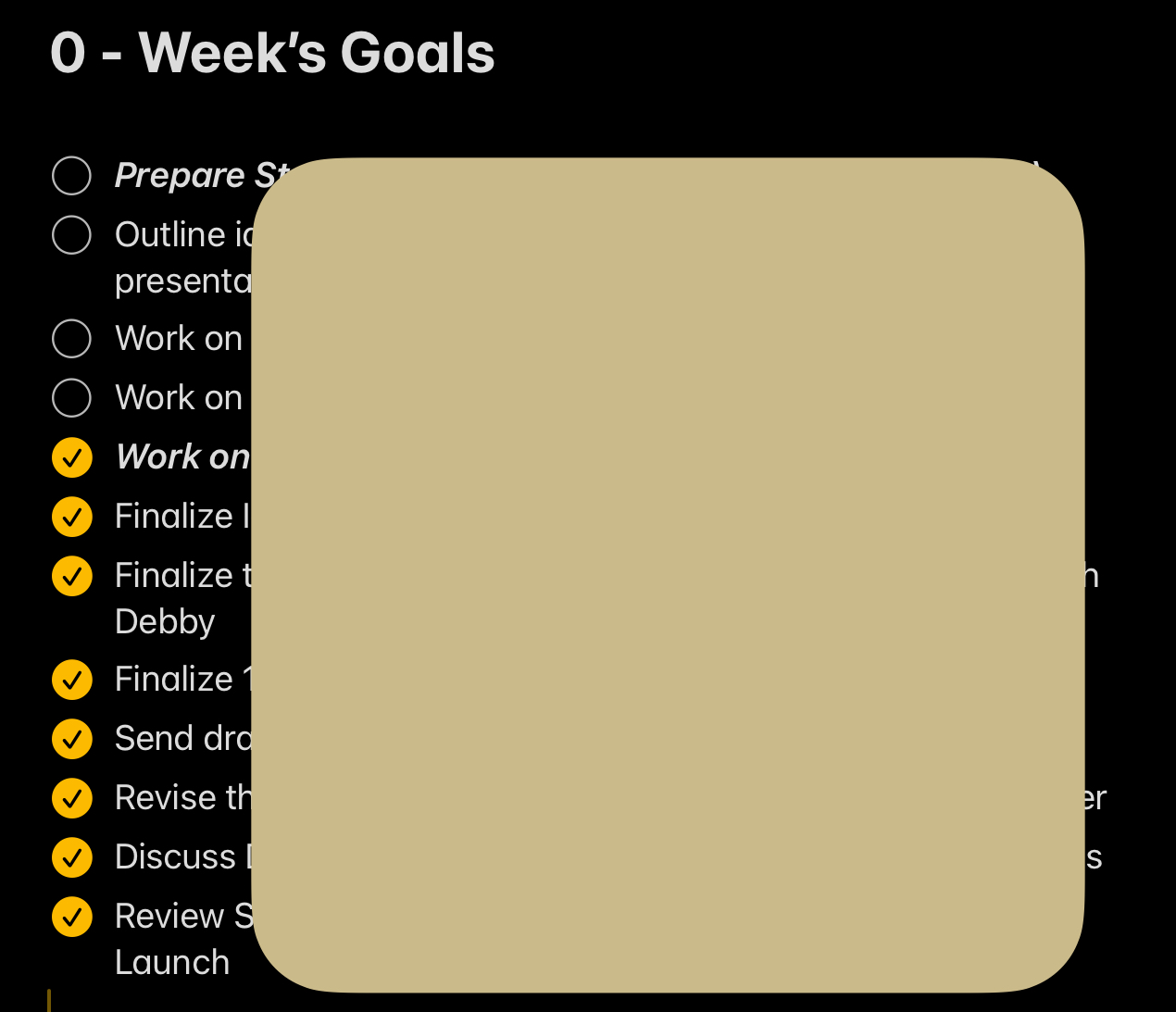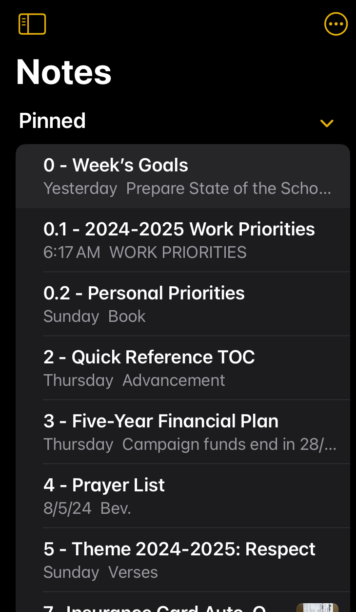 In Apple Notes, I have key pinned notes, including my weekly and yearly goals.