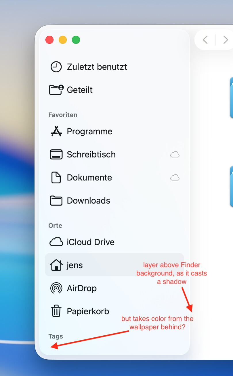 One irritating design decision that doesnât makes sense to me ârealisticallyâ is the sidebar in apps >like the finder, notes and others. A bit hard to describe and capture in a screenshot (I tried >:innocent:)