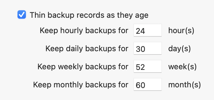 I have thousands of files but donāt require a ton of storage, and Arq allows me to thin my backups as they age.