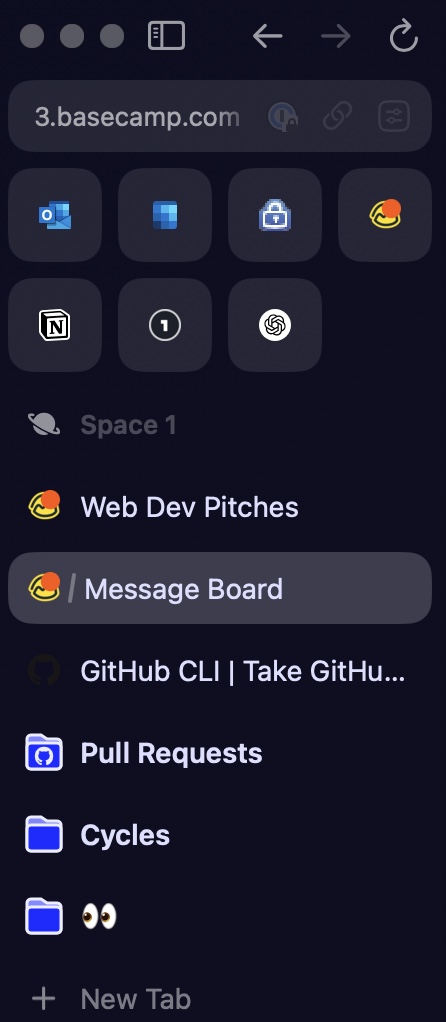 It can be so cozy, though! This is my sidebar view most of the workweek. Cmd+number for the top bento box shortcuts, cmd+t type for bookmarks in those folders. Pull Requests is a live folder that shows links when my attention is needed.