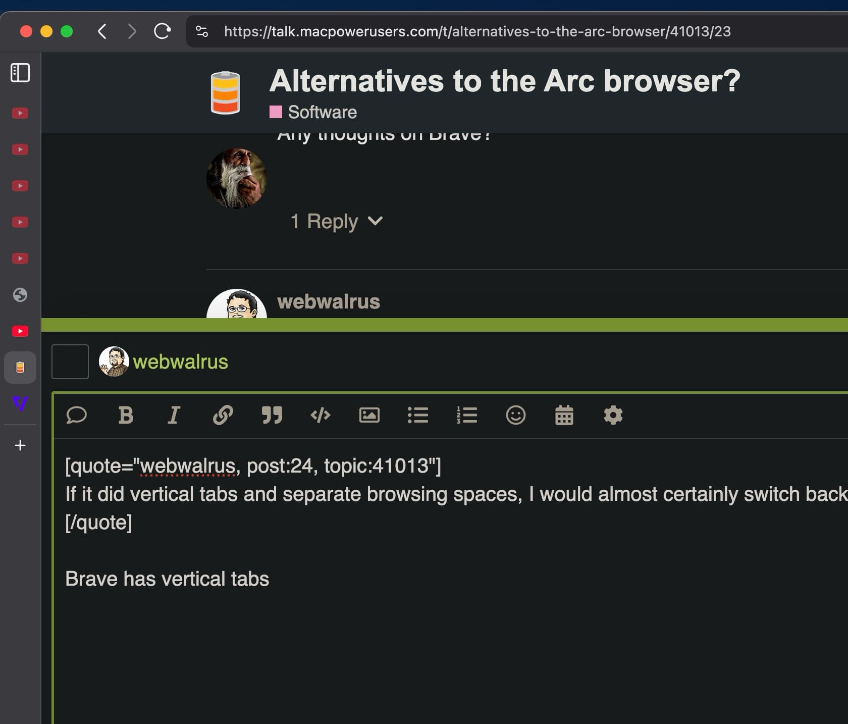 Brave used to be my primary browser. I switched away from it because it didn’t have vertical tabs, if I am remembering correctly. My current needs include having separate spaces, and I don’t think it does those natively.