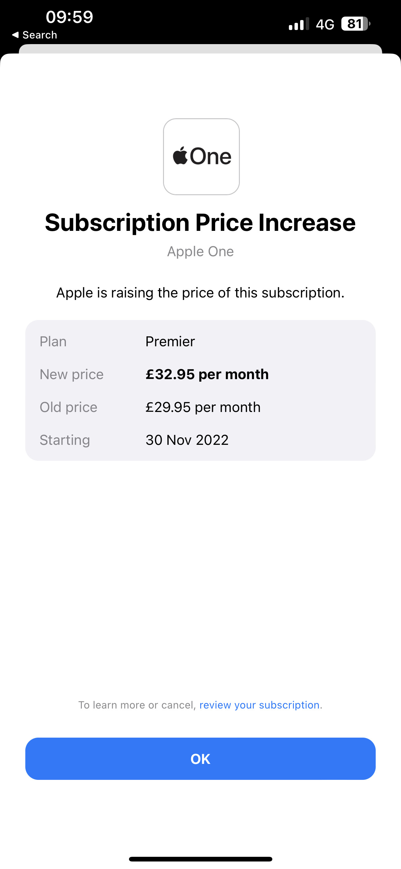 Apple is raising the price of this subscription from £29.95 per month to £32.95 per month. Your subscription will automatically renew for £32.95 per month starting on 30 November unless you cancel at least one day before. To learn more|