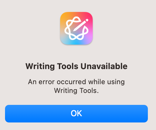 I have been trying to use the writing tools. just to proofread some writing. It does not seen to be working, I have tried it inApple’s own apps, Notes and and Pages, in Word and in some others. Each time this message gets come up. Is there a wider problem that anyone has seen, or is this local to my machine?