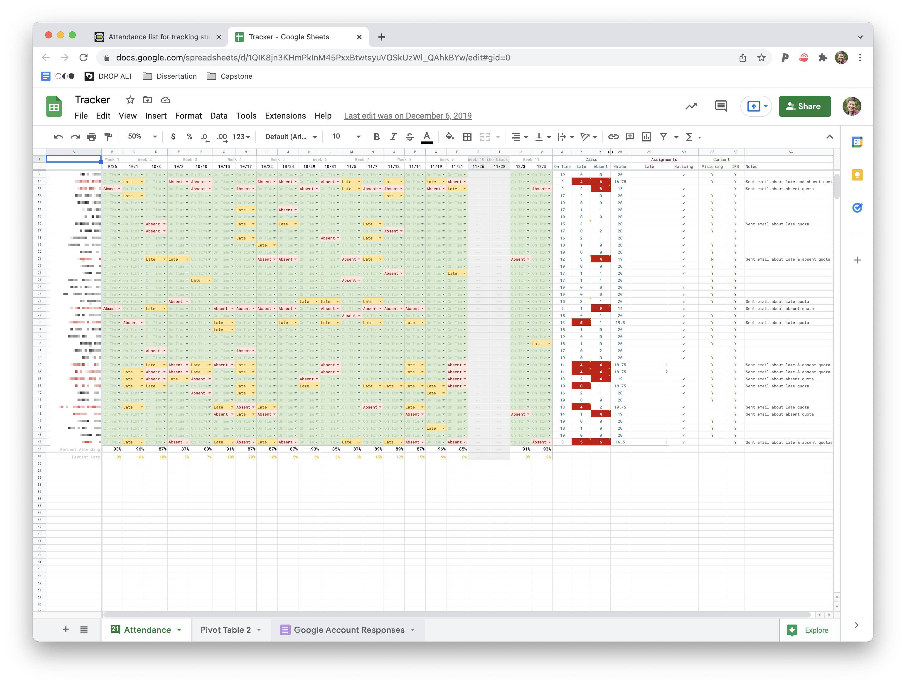 If I didn’t do all that, I’d probably create Google Form that fed a Google Sheets doc. I might even ask the students to fill it out. And I’d probably put a question on it to collect info that’d be hard to get otherwise. My favorite default question is something like “What questions do you still have about [today’s topic]?” or “What was confusing about [today’s topic]?”