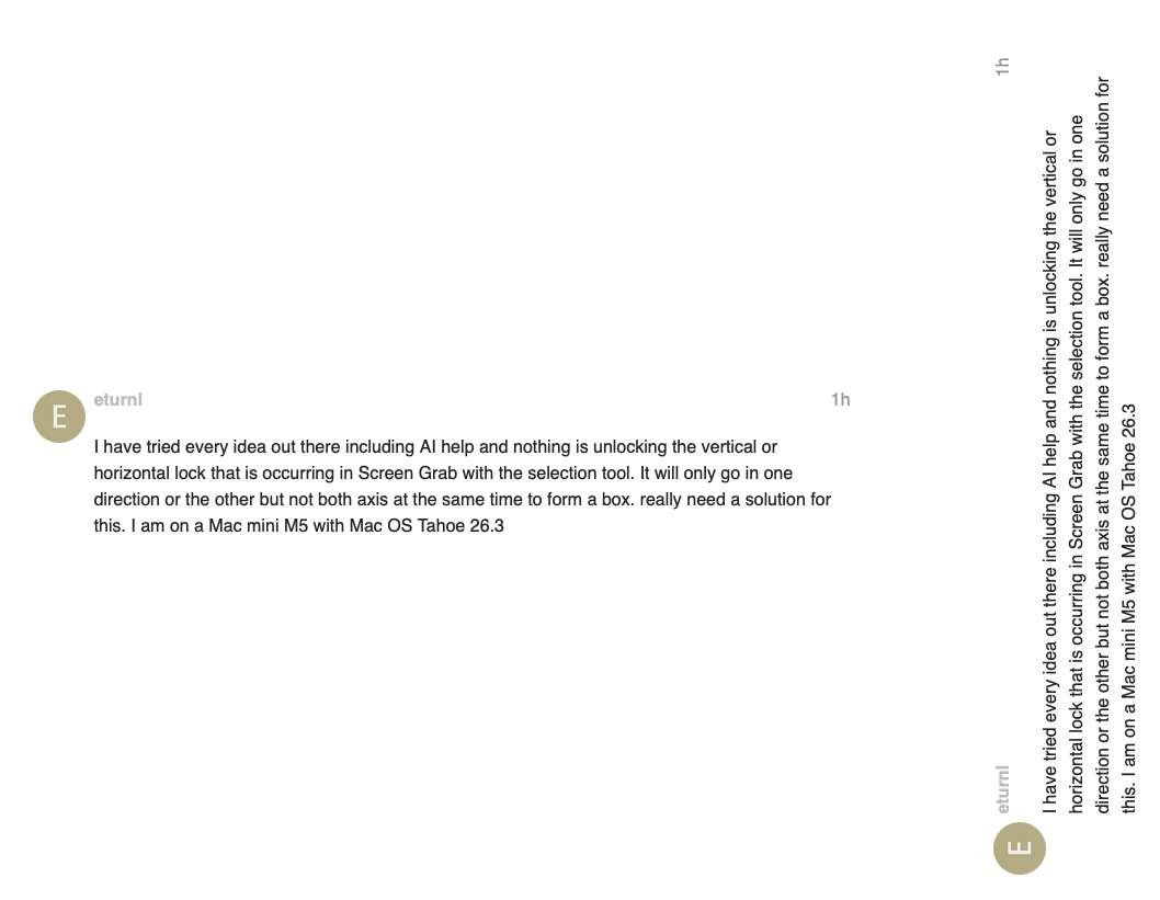 I have tried every idea out there including AI help and nothing is unlocking the vertical or horizontal lock that is occurring in Screen Grab with the selection tool. It will only go in one direction or the other but not both axis at the same time to form a box. really need a solution for this. I am on a Mac mini M5 with Mac OS Tahoe 26.3