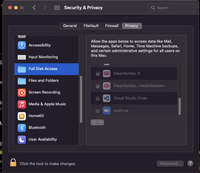 thing is that when I go to privacy I cannot find the full disk access option. It’s not there. I am running my mac from an admin account.