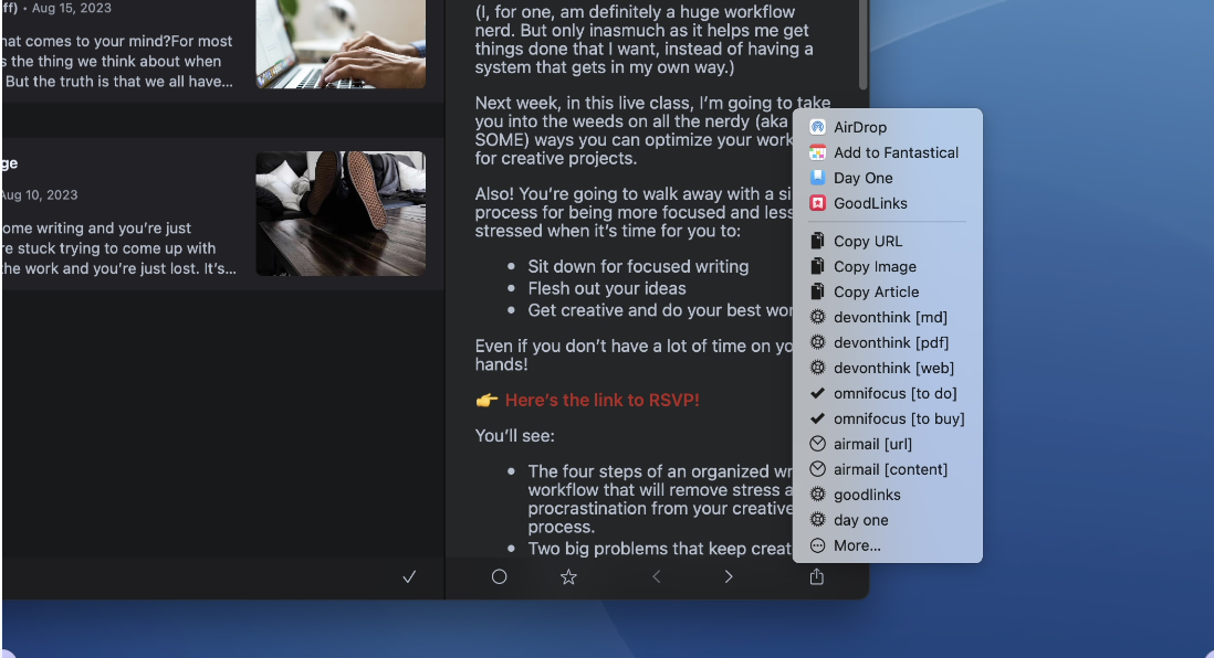 Last time I tried Reeder, the shares were only the baked in OS shares. There is no option to add URL Scheme shares, x-callback, etc. I do not believe this has changed. Fiery Feeds is the true successor to Mr.Reader for people who process rss feeds. Here is my Fiery Feeds macOS share menu. The iOS menu is even more versatile with contact specific shares.