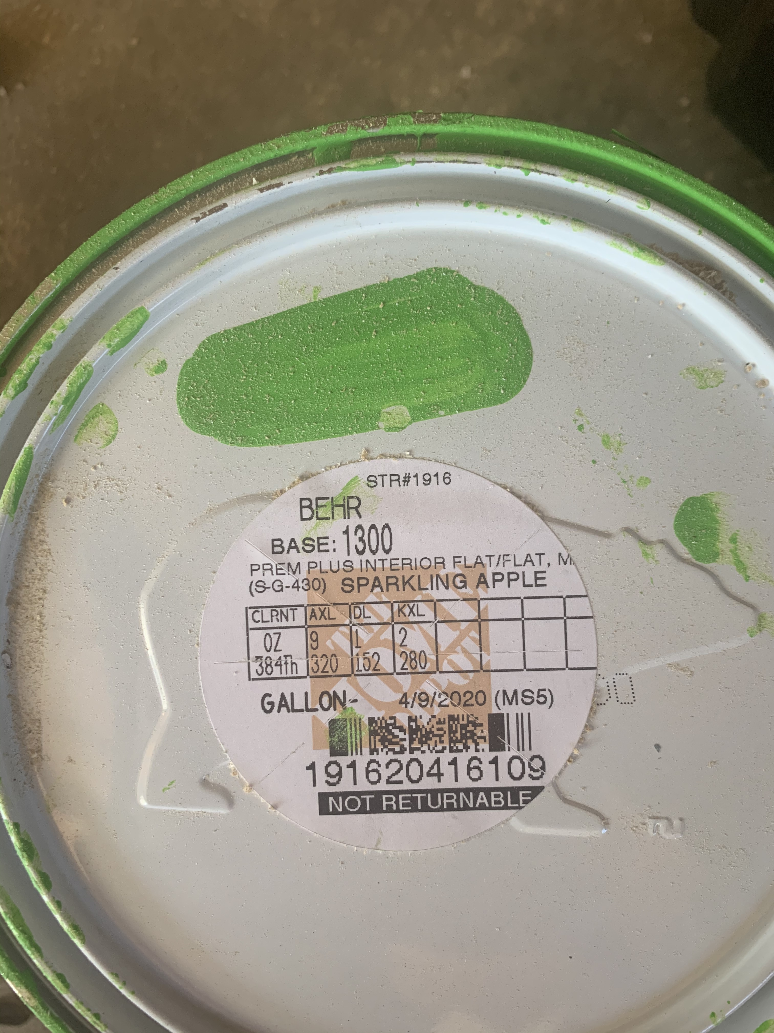Sparkling Apple S-G-430 Behr premium interior 1300 FLAT (don’t buy anything but flat, it will be too reflective otherwise). You will also need a roller and extension rod for the handle so you can stand and paint it.
