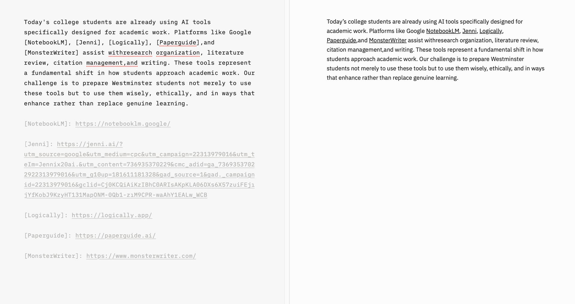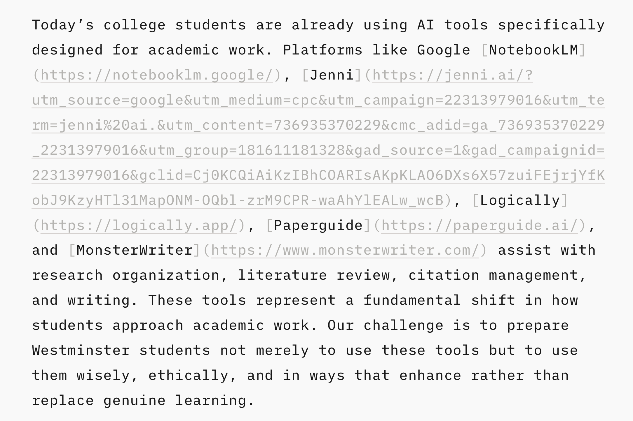 Here is a paragraph from my paper in iA Writer containing hyperlinks. It is a mess—who wants to see that when they are writing?