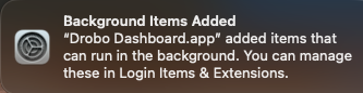 Could it be a permissions issue? Are there other permissions under Privacy and Security for the Drobo Dashboard that have to be granted? If so: turning them off and back on again may be an idea.