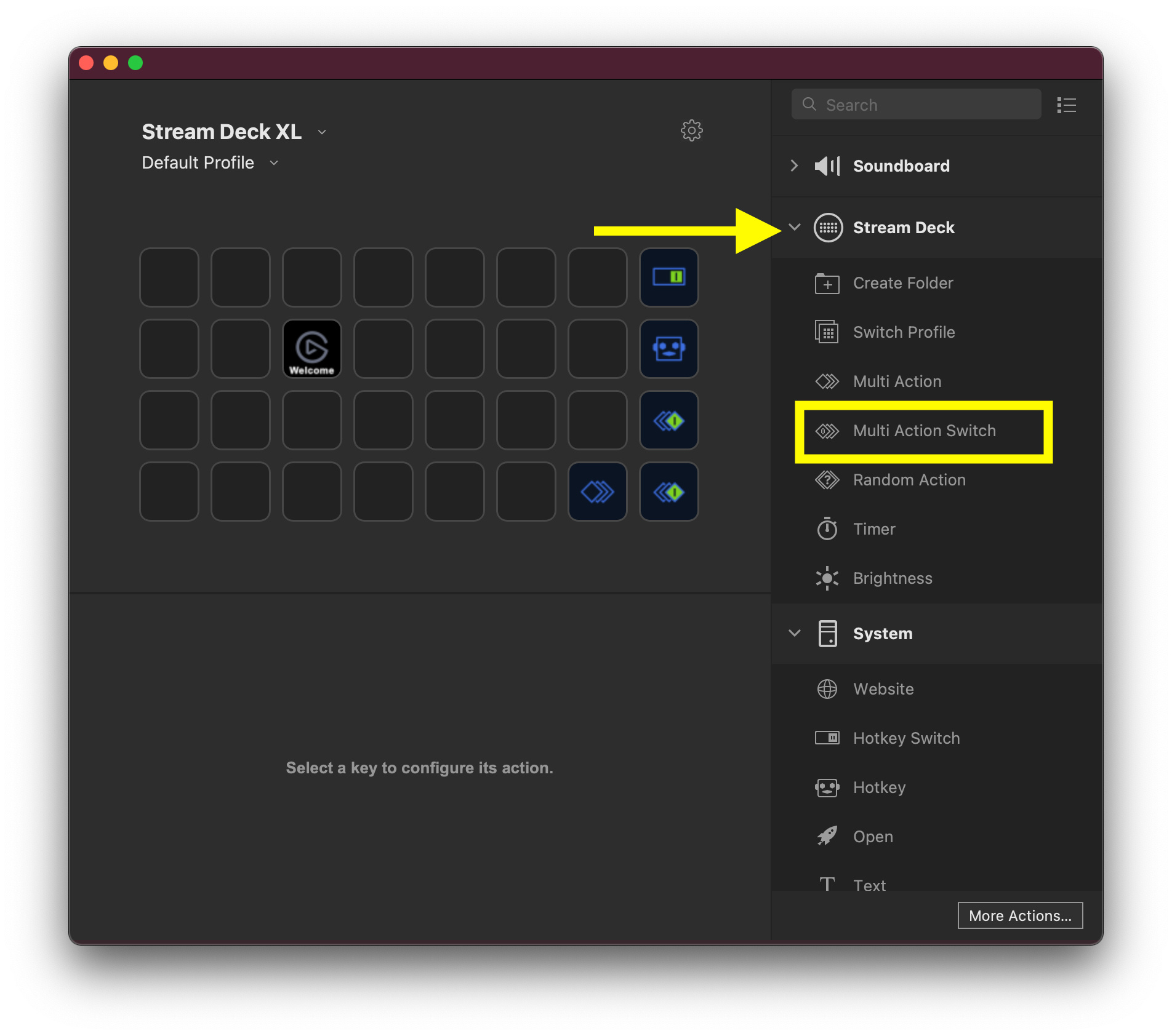 On the right-hand side in the Stream Deck app, look for "the “Stream Deck” header/section, and then “Multi-Action Switch”