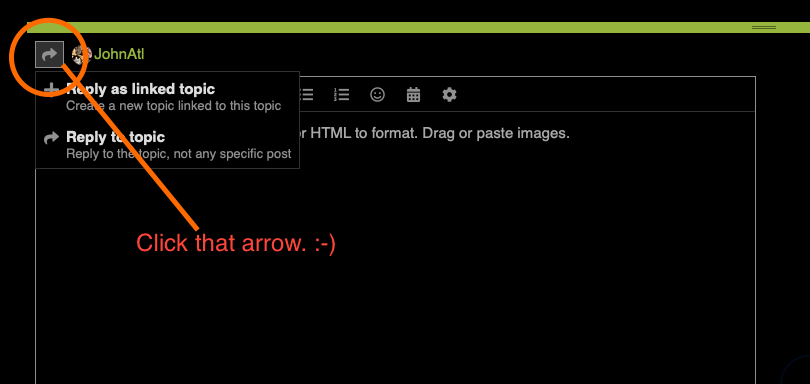 For me, in a desktop browser I hit the âReplyâ button. When the reply window opens, then in the upper left-hand corner of the reply window the arrow directly to the left of your photo and username is clickable. That lets me do the âlinked topicâ.