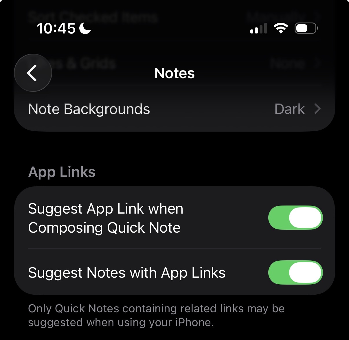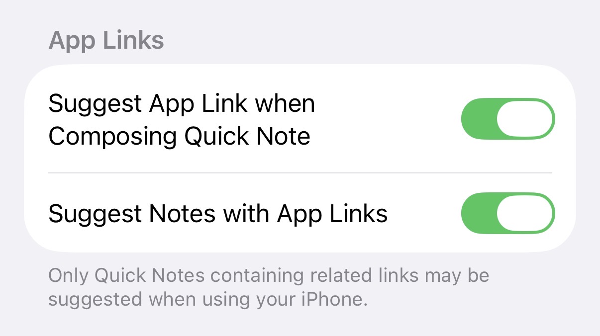 I am seeing this setting for notes: “Suggest Notes with App Links” - which to me would imply that there is a way to re-access existing quick notes within the context of another app.
