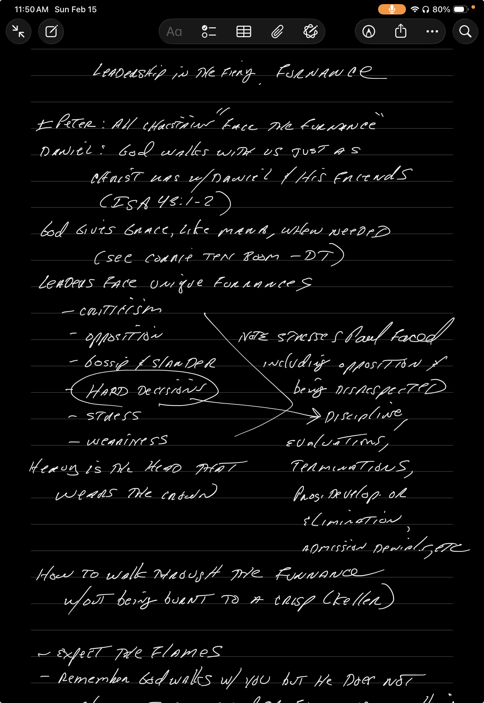 This morning I set out to write a blog article on leaders walking through the fiery furnace. Rather than building an outline in OmniOutliner or MindNode, I picked up my Apple Pencil and 11-inch iPad Pro and wrote one by hand. I think better with a pencil than I do when typing.