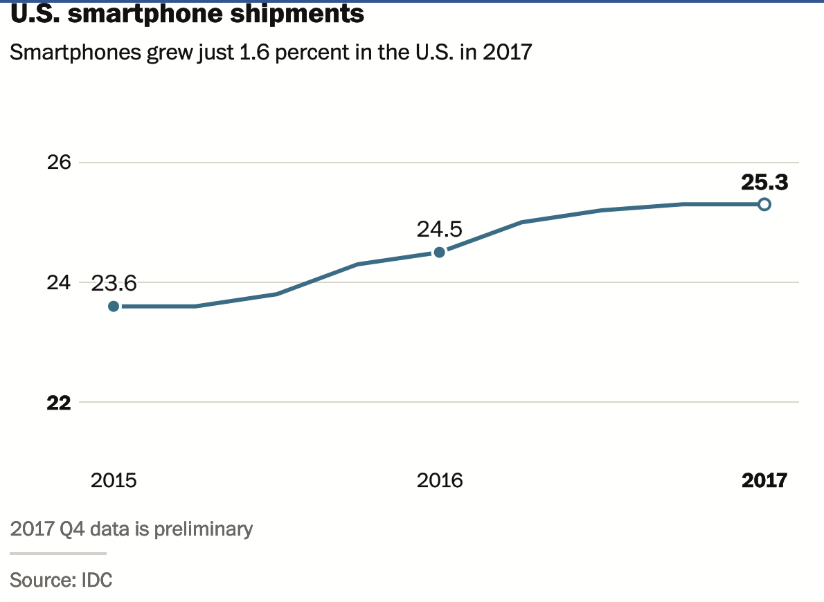 The Pew Research Center found that 95 percent of US adults now have mobile phones and 77 of those people have smartphones. That leaves roughly 17 percent who have yet to “upgrade.” Most of those people tend to be older (above 50). The smartphone penetration rate is 85 percent and above for those under 49. Saturation.