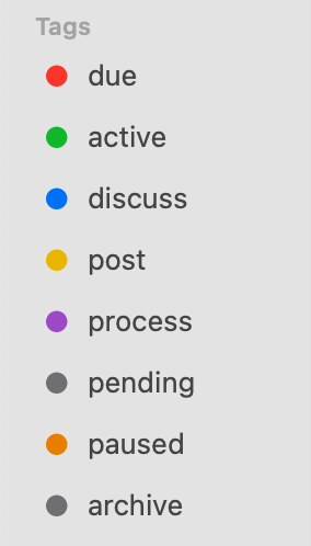 I consider Finder folders as static containers and Finder tags as dynamic indicators. Files are placed in a (sub)-folder following a project hierarchy. By example, you might well imagine the differences in files that I store in Documents/Finances/taxes/taxes 2025/submitted versus Documents/Finances/taxes/taxes 2025/resources. Once a file is placed into a Finder folder, I rarely move the file from the folder. I may, near the end of a project, tweak the name on the folder as the use-case demands. Separately from this, I have a distinct set of Finder tags as below. They track the status of a file or folder.
