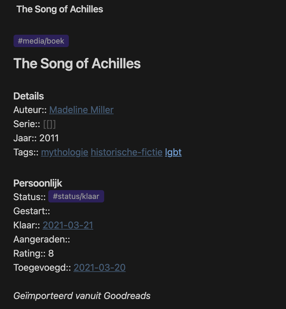 What I think my ideal would be is a note for every book, that tracks my notes and annotations, has all the bibliographic data in it and also allows me to see when I started and finished reading it on every instance of reading and re-reading. And if I re-read book the new notes and annotations add on to the existing book note. Problem is with over 3500 books so far in the library, about half e-books and half paper books I need an automated way to create the individual books notes from my existing Bookpedia database. Still not clean way to do that I can see yet. But I’m documenting ideas and playing with several tools.