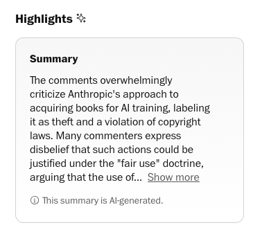 (Irony aside, WaPo appears to use Together.ai for this. It is not at all clear how the models Together.ai provides were trained. Maybe WaPo trained its own models from the ground up on its own content, and thus there are no ethical conflicts with this criticism of Anthropic?)