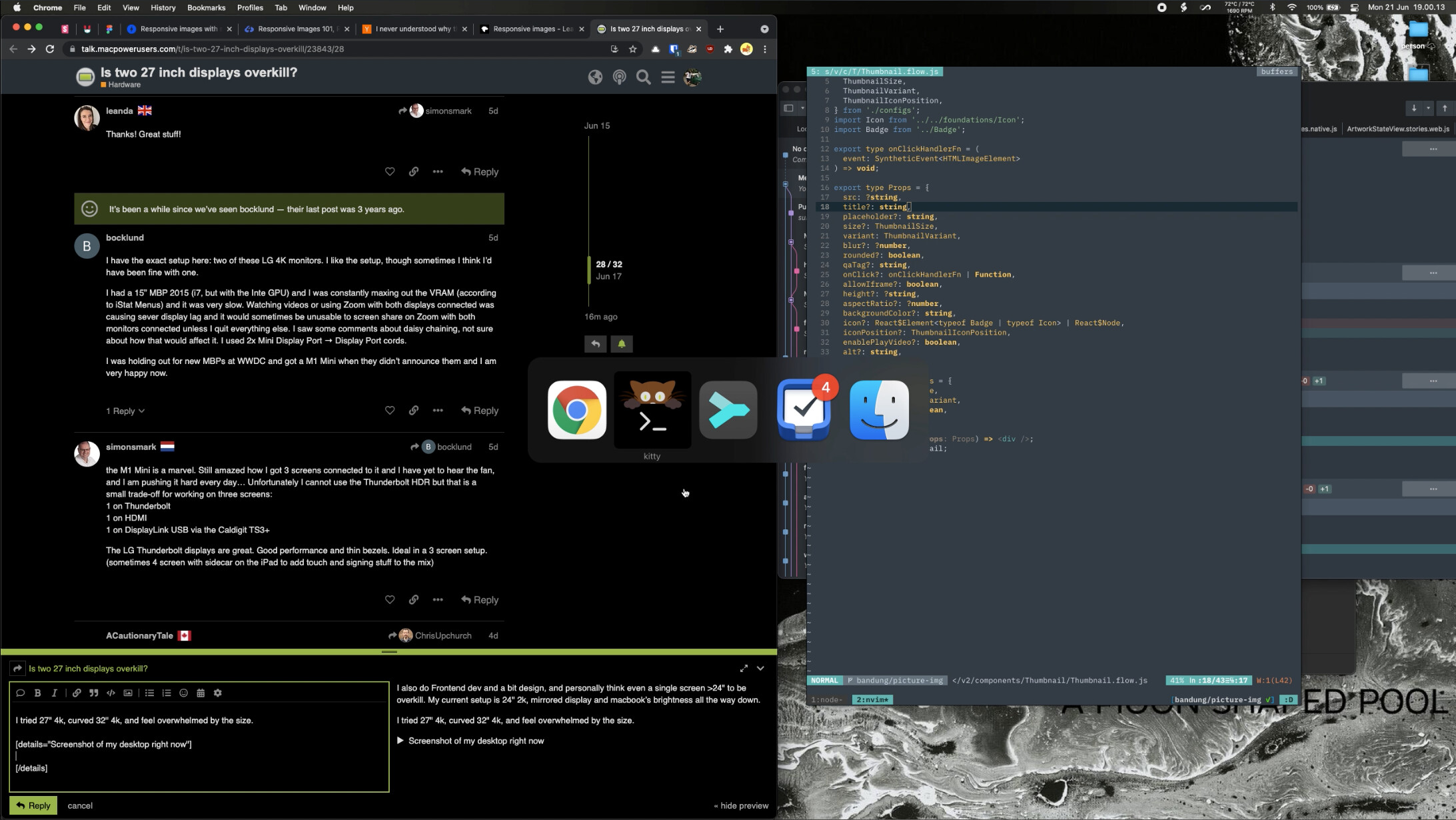 Soon figured out that I just can’t work on a laptop screen and 1 extra monitor. The 16" had difficulties driving three 4k displays however. It technically worked, but the fans were in overdrive all the time.