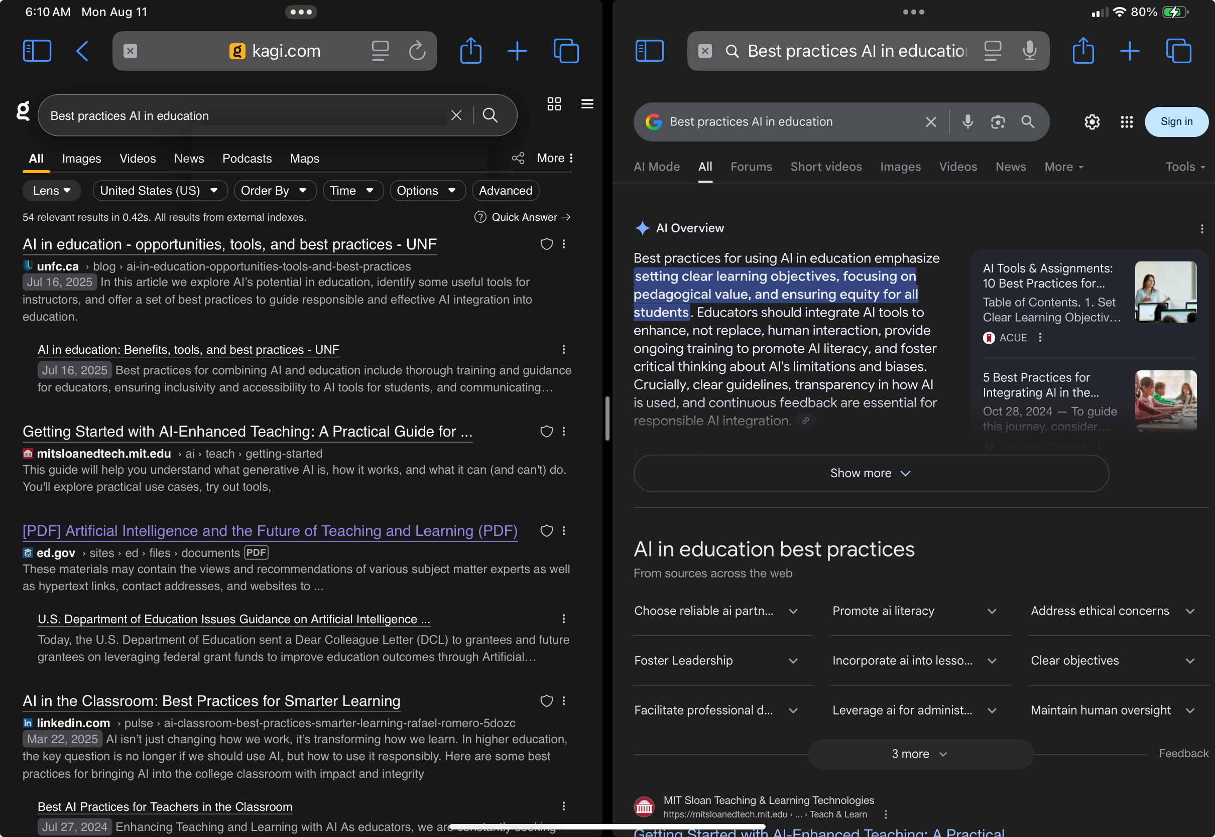 I want to emphasize that this is using Kagi’s free search and is just an early comparison. With that caveat, while the Kagi version is cleaner, I don’t see a substantial difference in the results. (I’m not considering privacy here—only the search results.)