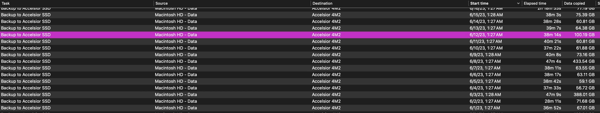 In an era where terabyte-size main SSD drives are common for the Mac, I think it’s relevant to ask how to back up such a drive. It takes quite a while for me to back up a large devonthink database or especailly my entire 8TB SSD. With a 26,0000 MB/S internal SSD I could easily do a daily clone of the main drive.