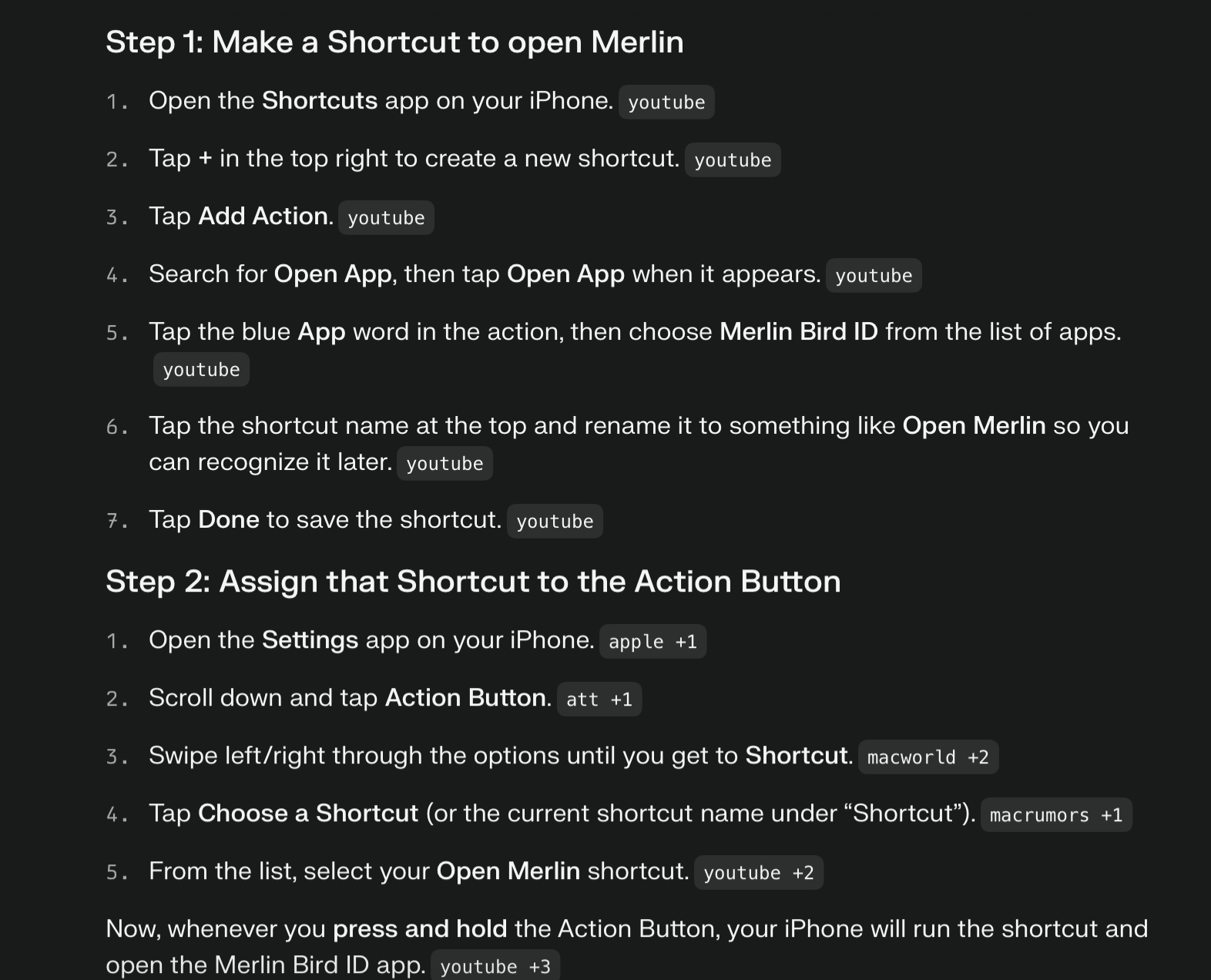 Thanks for this question! Had a 17 pro for for as long as they were available and never used the action button. Now I have solved one of my biggest issues: getting the Merlin Bird app open fast enough to identify a bird song!