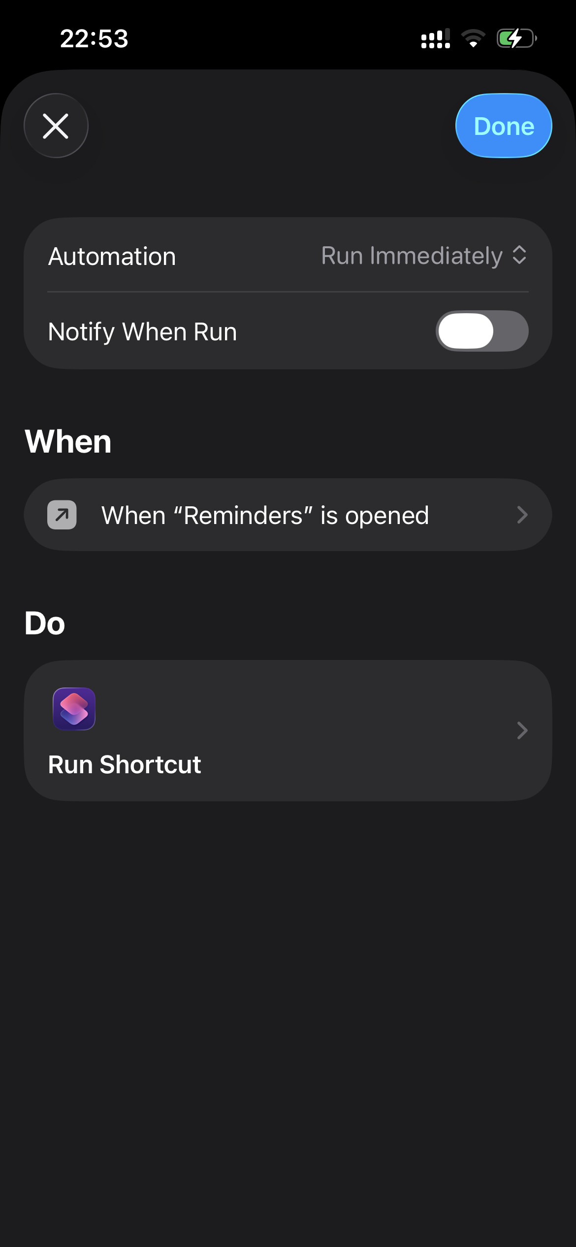 • I use a Shortcut (1, 2 and 3) and a Shortcuts automation (4) that runs every time I open Reminders: