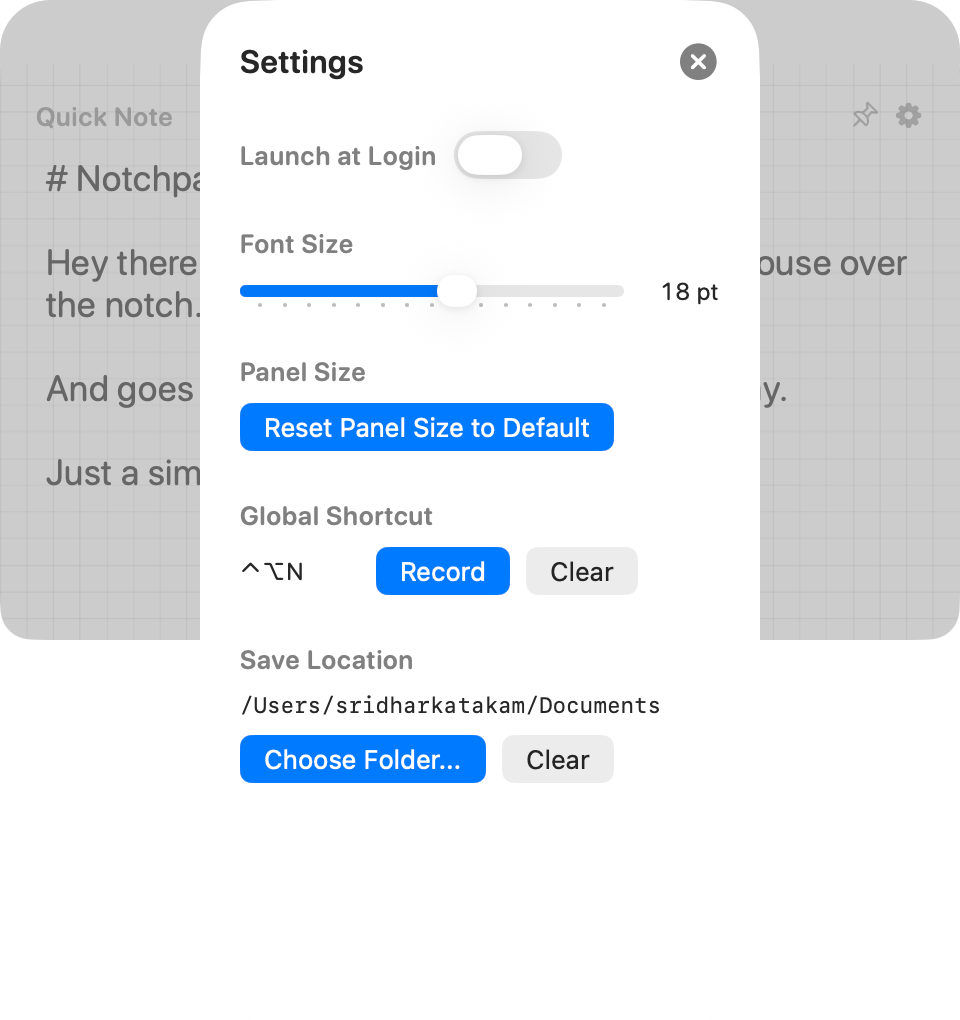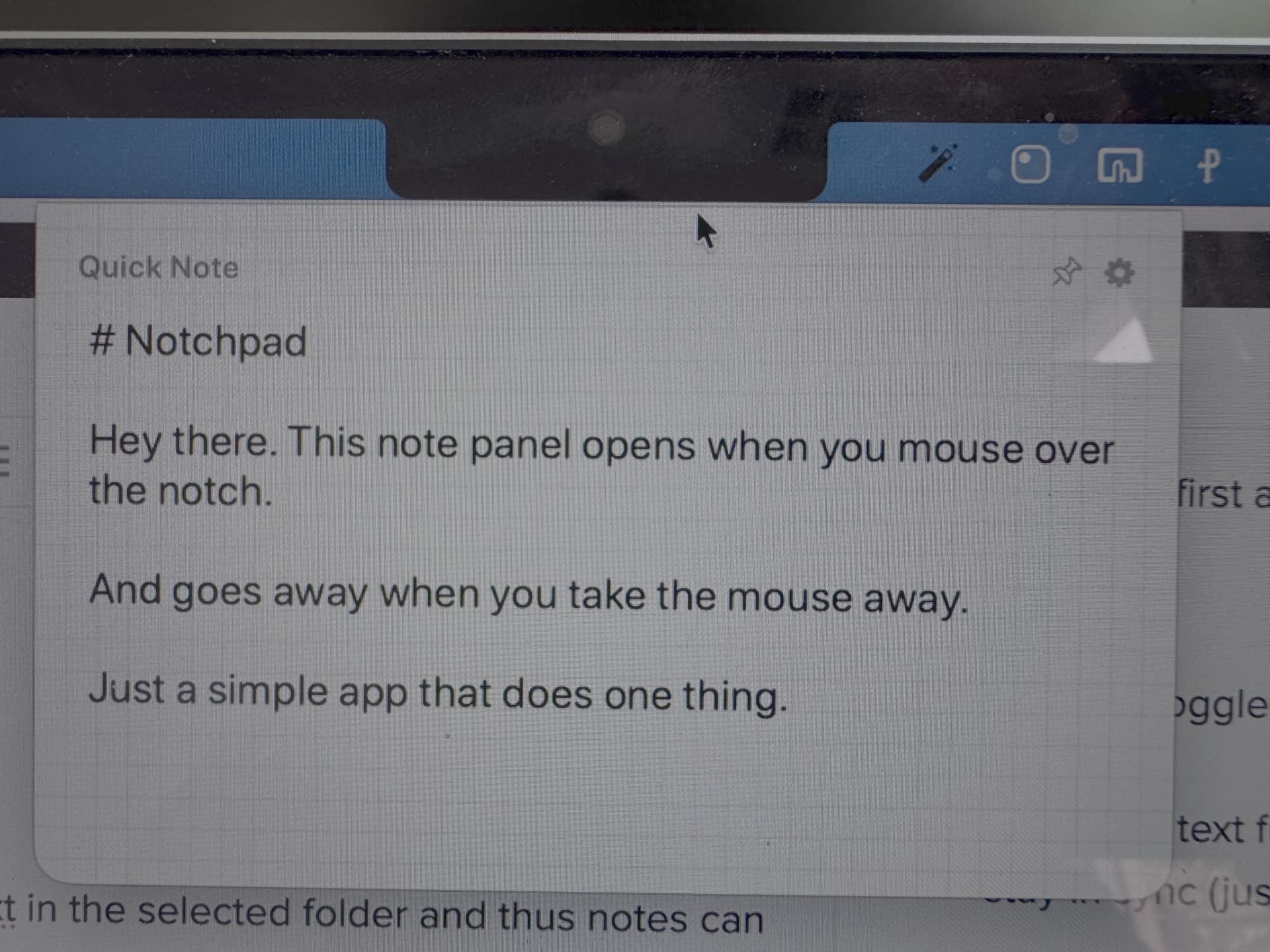 - Loads the text from a file named Notchpad.txt in the selected folder and thus notes can stay in sync (just select a cloud folder).