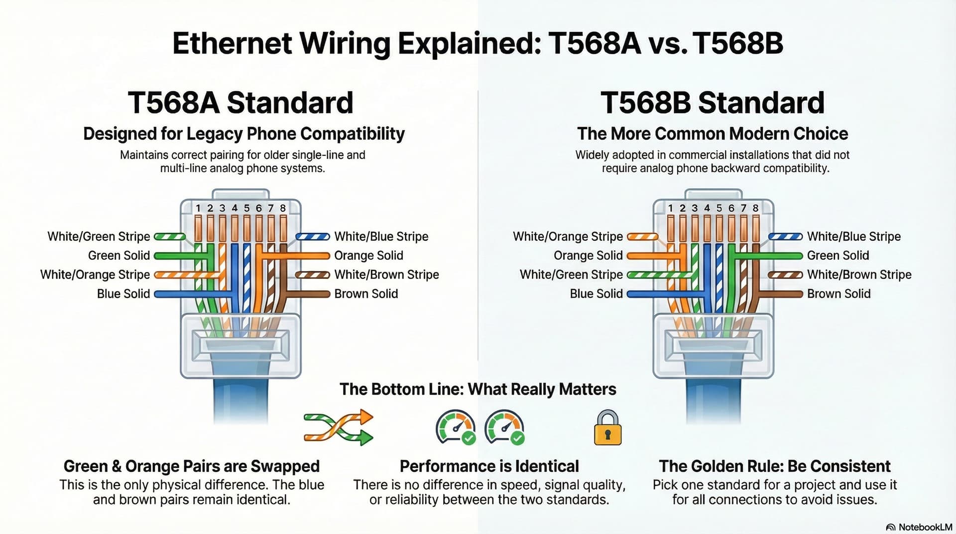 Create an infographic showing side-by-side in a “this” versus “that” explainer, the wiring of RJ45 Ethernet using T568A versus T568B. Show only the modular jack with a small tail of the wire itself and emphasize the wiring of the pins inside the jack. Make the stripes on the colored wires thick enough to easily distinguish between the solid color wires.