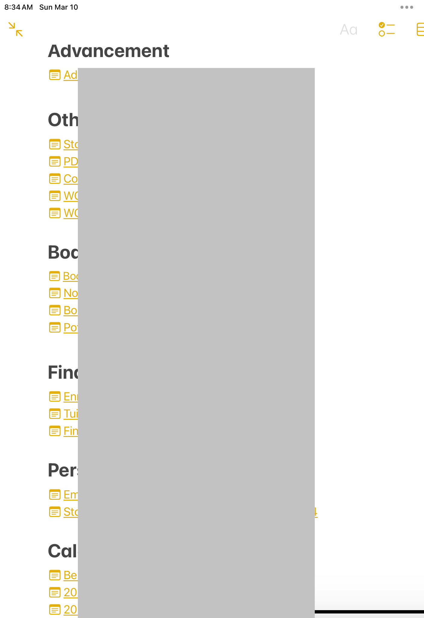 I have limited my linking to creating a quick reference table of contents. I can do that effectively and efficiently using Apple Notes, as shown below. Again, this is a matter of personal preference and workflow needs. Creating and managing links across my notes takes more time than anything I have gained from doing so. This is one reason why I use DEVONthink for all of my research. The search capabilities are so strong that I can quickly find any related material without creating links that may or may not be maintained should I export my material elsewhere.