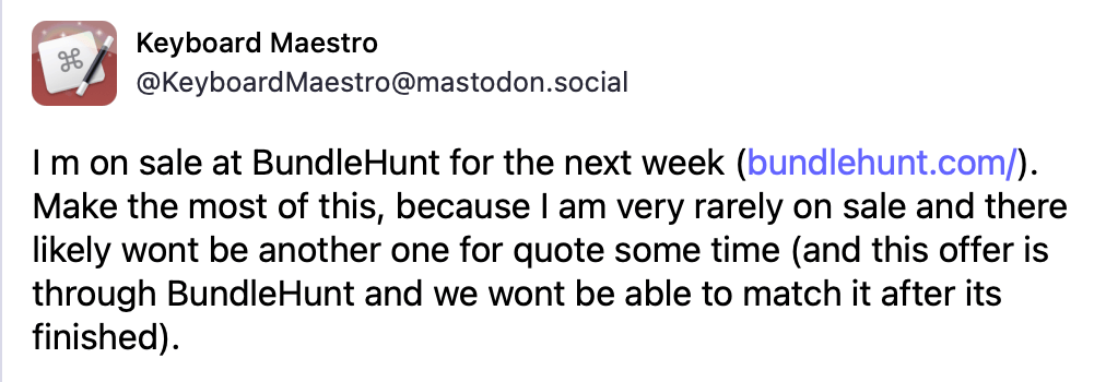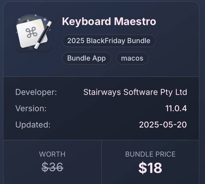 Keyboard Maestro is on rare discount sale for $18 on Bundlehunt. (until Nov 24, 2025)
