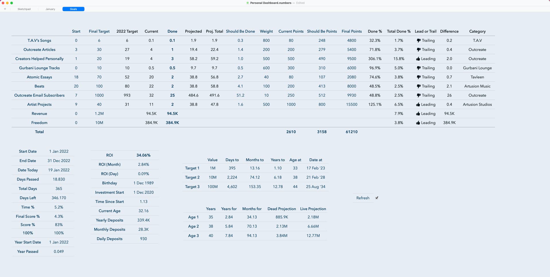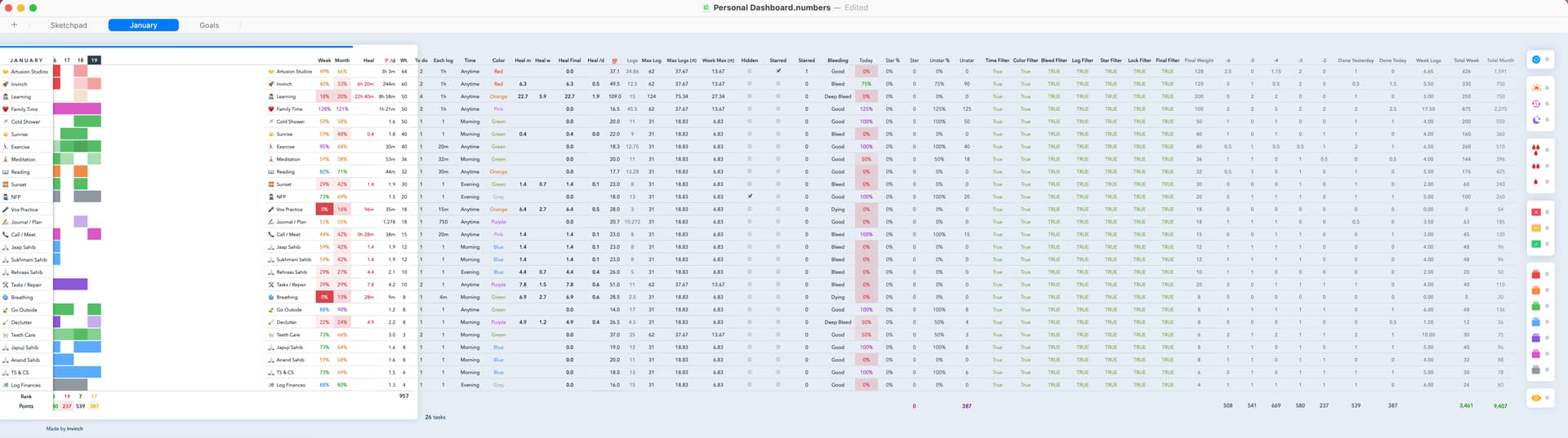 This dashboard/tracker is really impressive and inspiring, @tav! Thank you for sharing your work. In the coming weeks, I’m hoping to build my own goal and habit tracker based on your design.