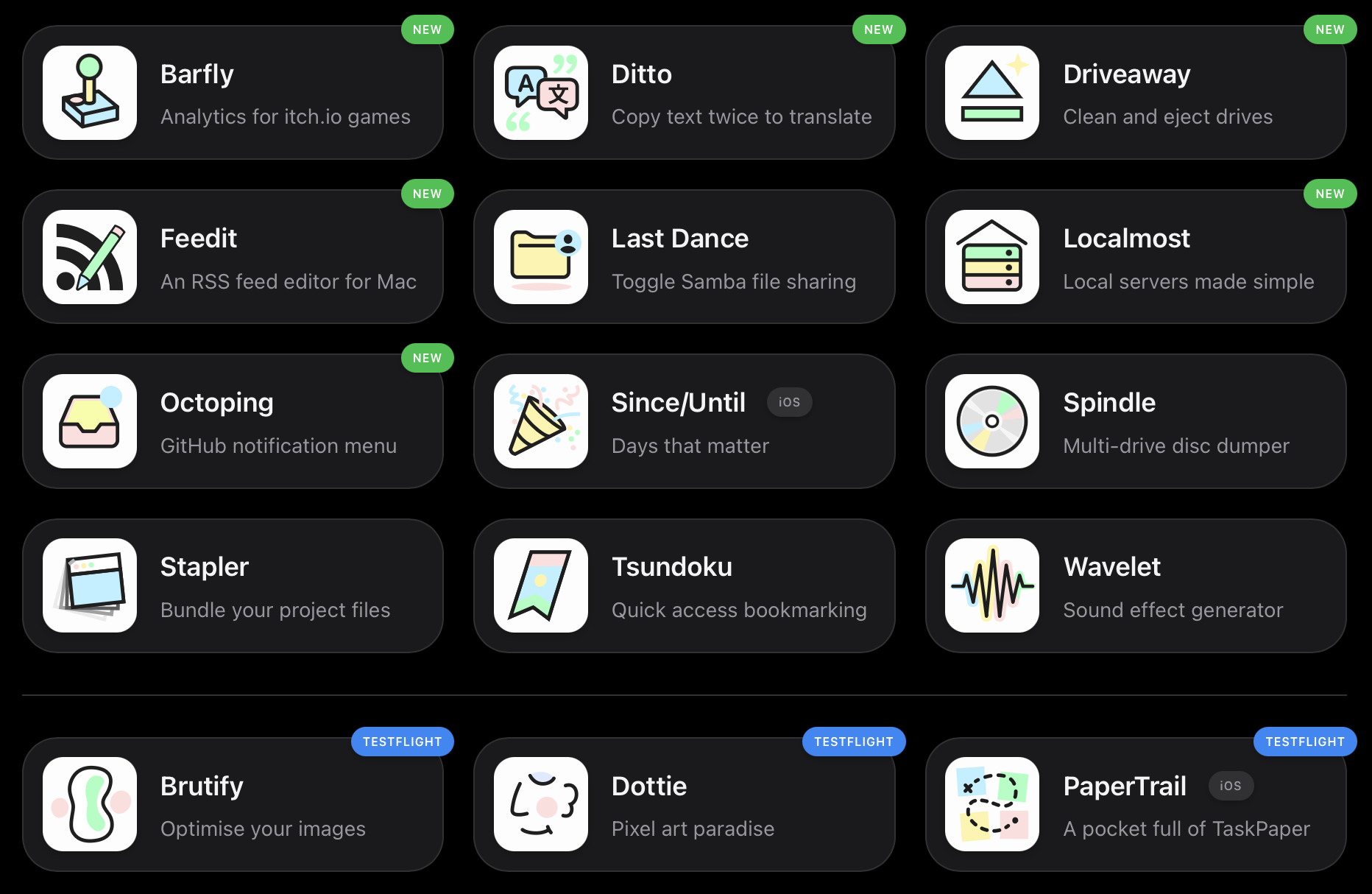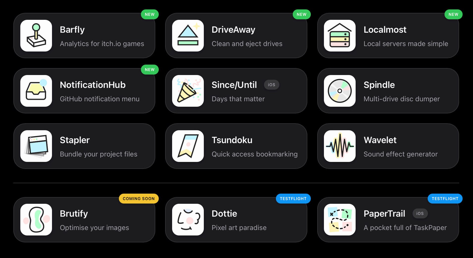 Website is done. Each icon leads to a detail page with app store link, elevator pitch, screenshots, mockup menu bar, top features, detailed features, changelog. Site supports dark mode (each screenshot exists as both light and dark) and of course is responsive for mobile.