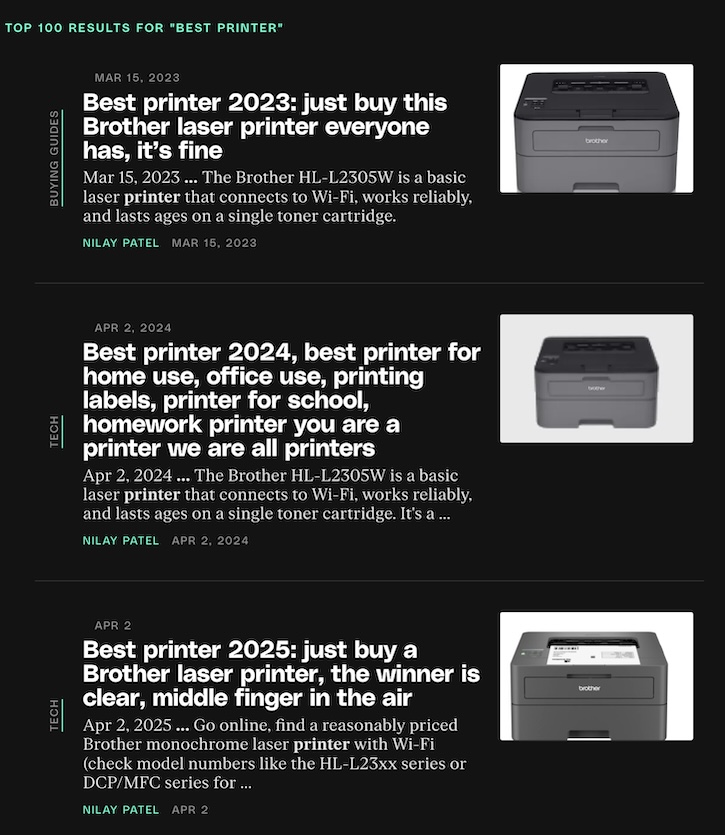 It’s always coming up here (see New inkjet (or other) printer in 2025? for the last go-around) and elsewhere – if you can get by with monochrome laser, get any Brother. We’ve got two (one in 2016 and the second in 2019) and they never fail.