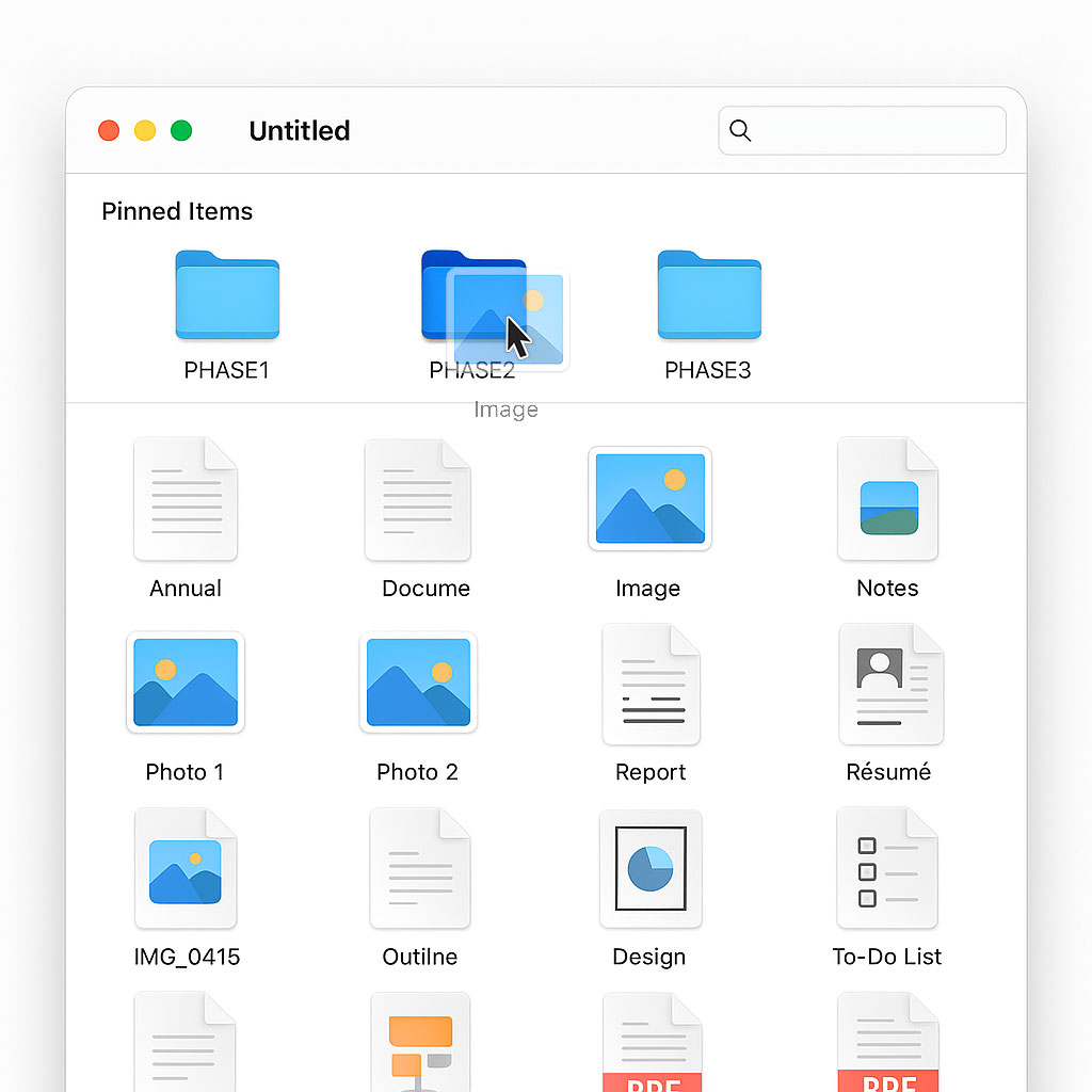 This would be particularly useful in Icon View and Column View. For example, in a folder containing hundreds of files, I might pin three key folders named PHASE1, PHASE2, and PHASE3. Those folders would remain visible in a “Pinned Items” section at the top while I scroll through the rest of the contents below — making it much faster to drag and drop files where they belong.