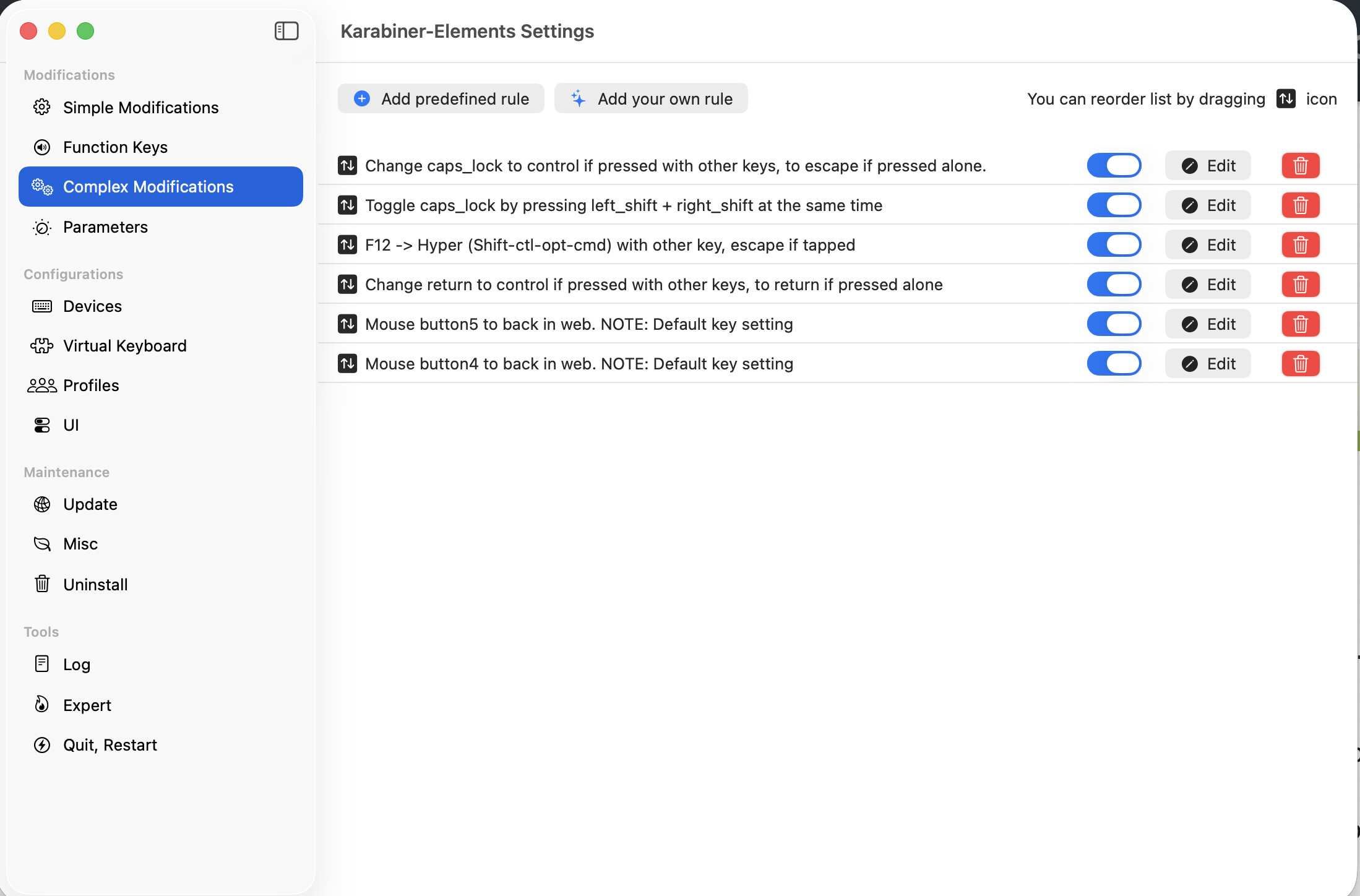 When you’re happy with that, then on the Complex Modifications tab, you’ll find a button Add predefined rules, which takes you to a website with hundreds of user-defined modifications. I use the following ones, all of which I ‘borrowed’ from that site…