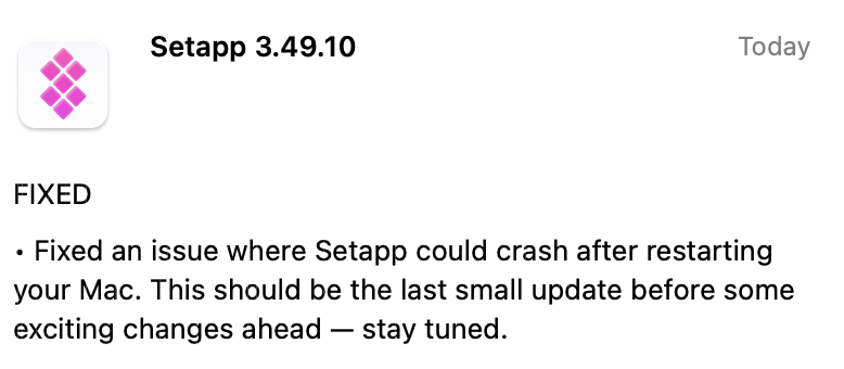 I’ve seen a couple of Reddit threads on this where, despite the latest Setapp update where it says it’s been resolved, it is still happening (definitely for me) and the only fix is to uninstall Setapp via CleanMyMac, then reinstall - and everything is fine.