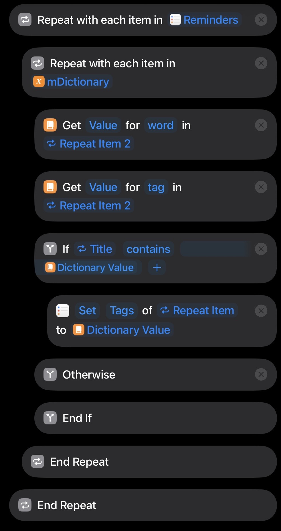 The shortcut scans your tasks based on a custom dictionary of action verbs (or any keywords you choose) and automatically assigns the corresponding tag.
