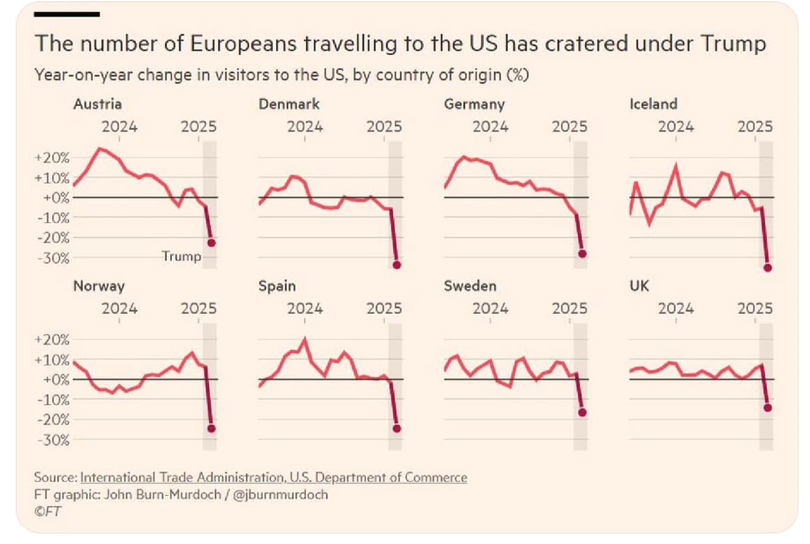 At this point, the trust in the US as a partner and an ally is in freefall and diminishing quickly. Take travel to the US from European countries, for example, and this is just in one month. These have been the closest US allies for 80 years. There’s no reason to think it will be any different in other sectors, tech included.