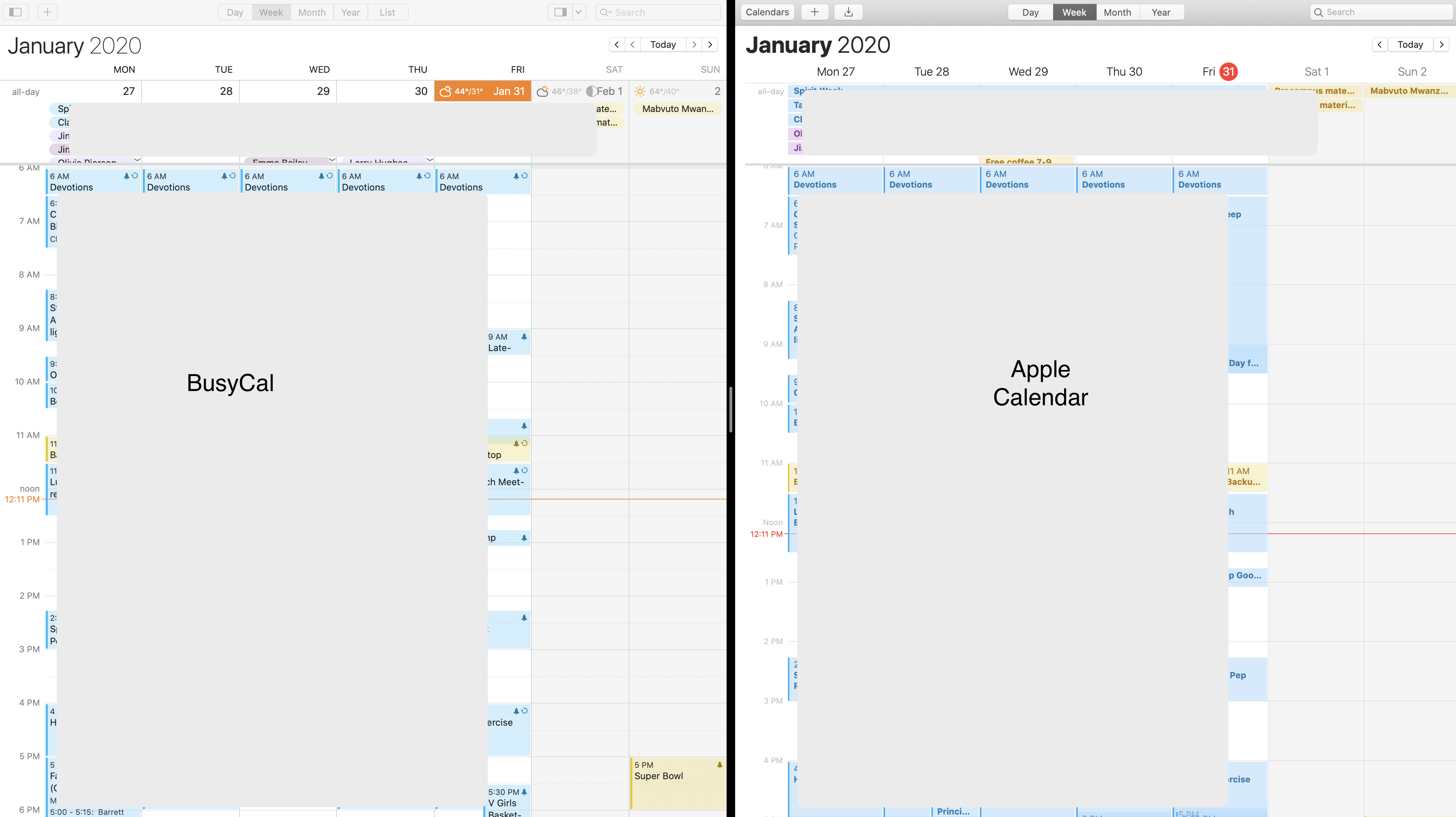 Out of curiosity I reinstalled BusyCal on my Mac. I had purchased it sometime ago but for over a year now I have been using the default Apple calendar. When I put them side-by-side, there is minimal difference. I know there are a few tweaks here and there in BusyCal in terms of alarms and some other features but frankly, I donāt see much advantage in a program like BusyCal versus the stock app. Perhaps Iām missing something? And of course, I will need to continue upgrading BusyCal if I were to use it whereas the Apple calendar is completely free. To me, it makes sense to just stay with Apple calendar. In short, I just donāt see anything compelling to justify the cost in the non-stock calendar apps. Thoughts?