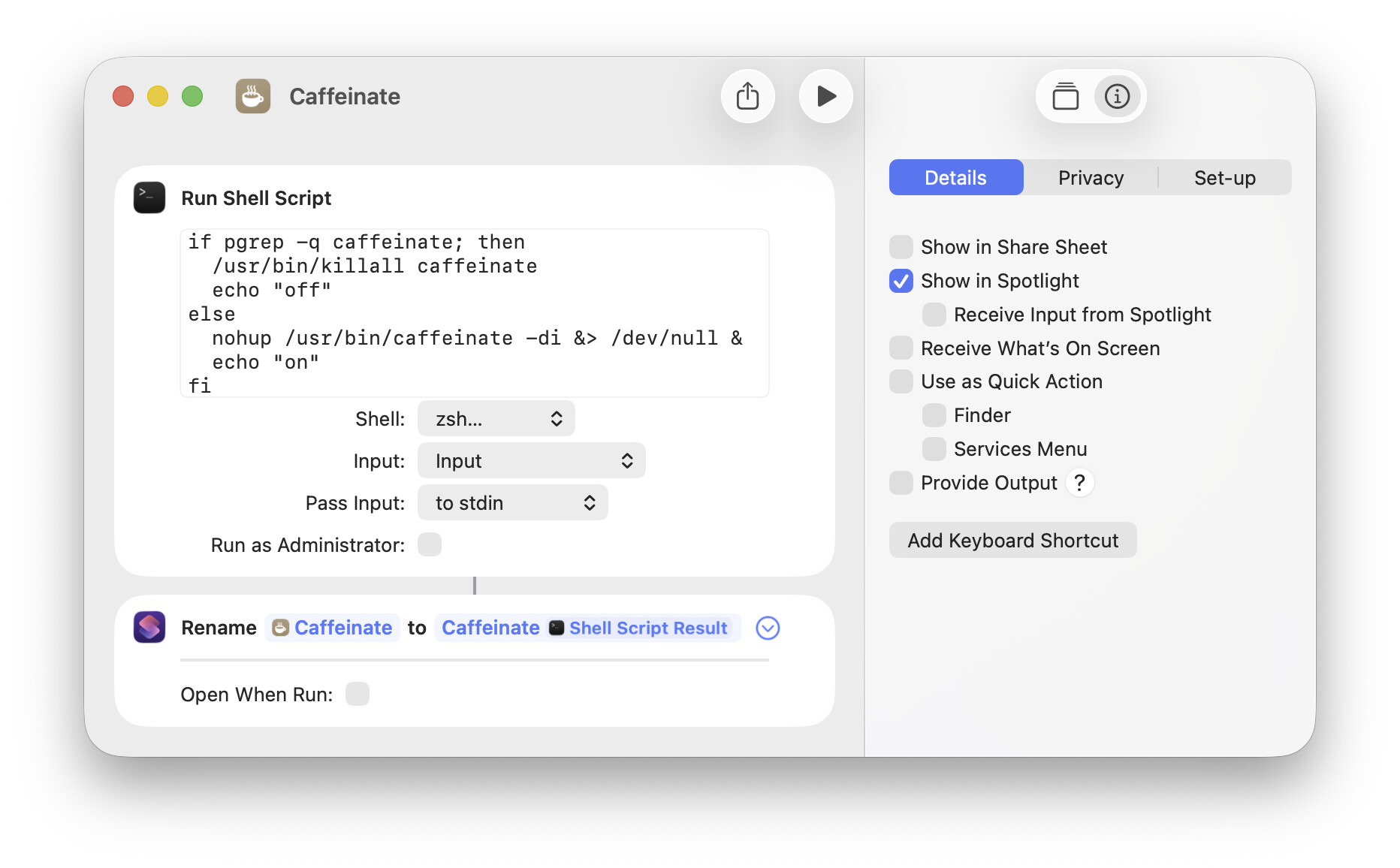 The shortcut only has two actions. A shell script checks to see if caffeinate is running - if it is, stop it, otherwise start it in the background to prevent system sleep: