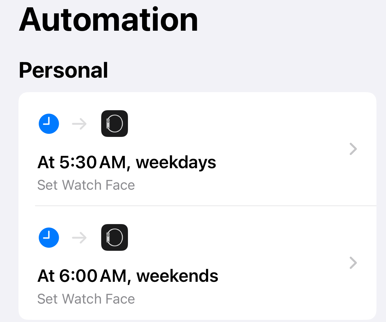 The final step is to set the watch face. In iOS17 I couldn’t find the watch shortcuts on the iPhone. There are some shortcuts, apps, and actions listed, but searching at this level didn’t bring up the Watch actions. To get to them, you need to tap “New Blank Automation”, which also gives suggestions — but at the bottom there’s another search bar. If you search for “watch” here, you should find the “set watch face” action that allows you to choose from your current set of faces. And that’s it!