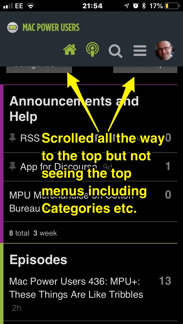 I have a slight problem on my iPhone view of the forum. I didnāt realise there were menus at the top because even when Iām scrolled all the way to the top they are missing, almost but not quite completely overlapped by the Mac Power Users Home Heading Bar as shown in the screenshot below. If I tap on the bottom leading edge thatās sticking out that just shows, I can then read the drop down menu but canāt see it on any screen as you can see itās mostly obscured: