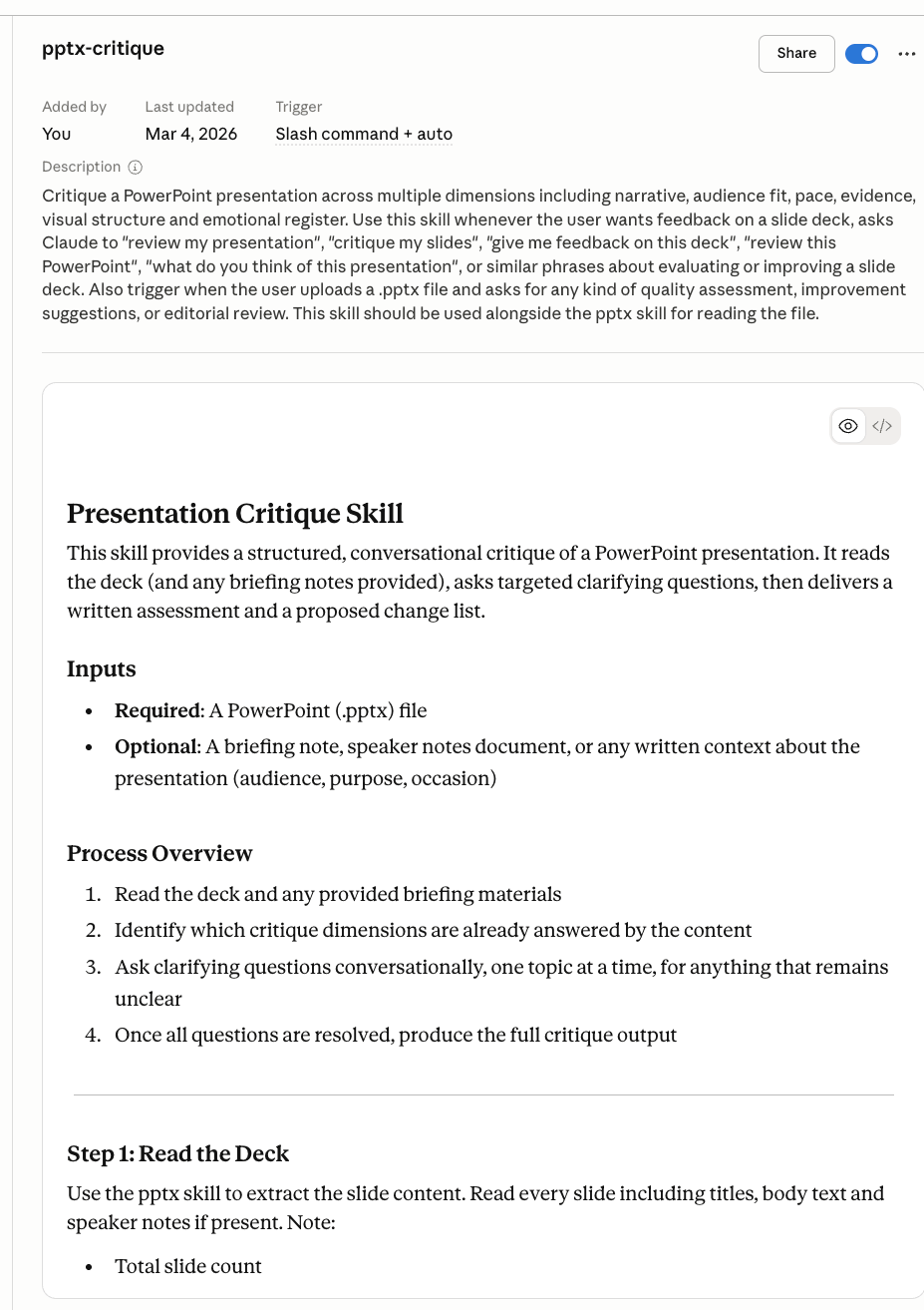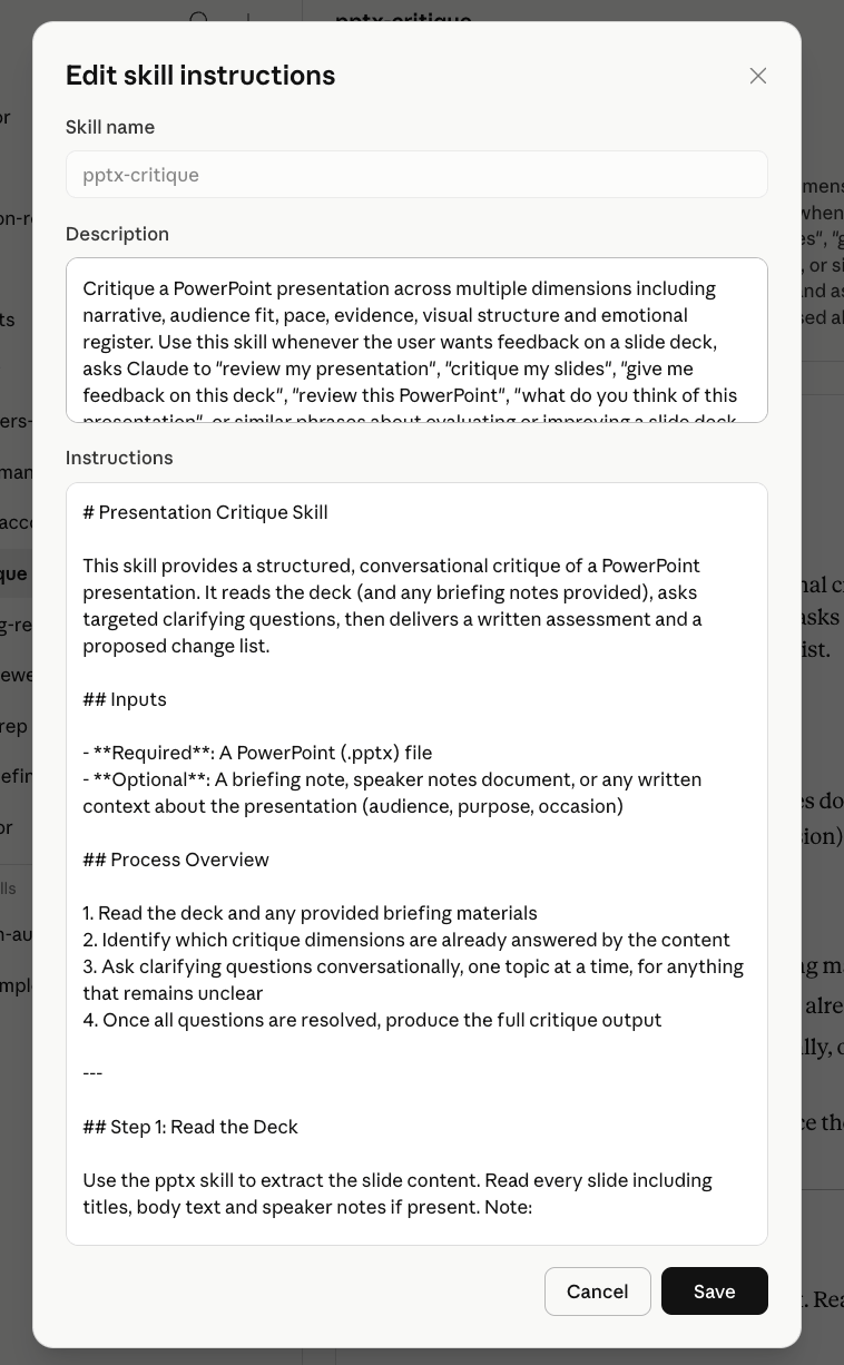 I still prefer the MacSparky RA organisation of having the skills in Obsidian, along with the skill index and associated files. The skill oftens references other, related files. They are often works in progress so for example, a separate log file is also useful. A lot of my skills are project-based so each project folder also has a README that the skill might also need to look at. I can see how if you’ve got a locked-down eg ‘process a powerpoint’ skill that only references the doc you give it and you don’t use Obsidian (or some other MD app) then you may as well keep it in Claude.