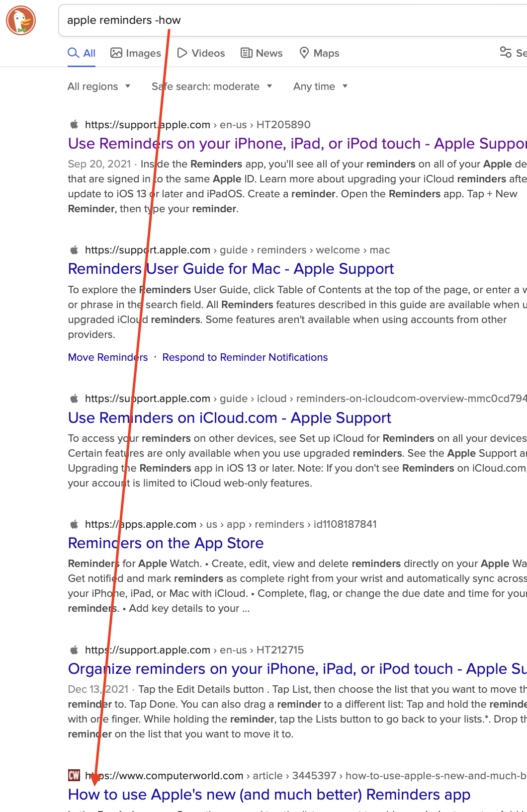 Perhaps I’m doing something wrong, but I’ve grown frustrated with the inability to limit the search parameters in DDG. For example, when I search with DDG with the search string apple reminders -how, articles with “how” still show up, as shown in the first screenshot. Articles with “how” do not appear in a Google search; see the second screenshot.