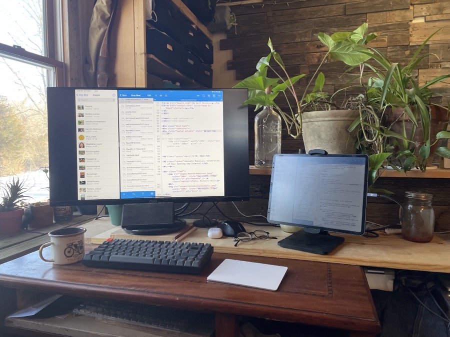 While I’m at the Mac this same client messages me with a few requested changes to his website. I instinctively reach over to the iPad attached to the Magic Keyboard and open Textastic in split screen with Messages to reference the text and images he’s sending. He also sends a hyperlink to gather additional images and text from a website so I tap over to Safari. I select some text with the Magic Keyboard trackpad and copy. Then I use my finger to tap and hold an image in Safari, then use another other finger to drag up the dock and open Files to navigate to my client’s website folder. I drop the image in. As my hands are already near the screen I use my thumb to drag the dock up and tap over to Textastic. I finger tap the images folder, then tap and hold the new image to rename from the contextual menu then rename it using the keyboard. The client wants another image that I have in my Photos library so I Command-Space and type “flowers” and from those Spotlight results I open Photos app which opens a search for my flower images. I tap the “moments” section of the photos search results which has groupings based on date and within a few seconds I’ve got the image. I tap the share icon to send the image to a shortcut that resizes and compresses the photo which I save straight to the website images folder.