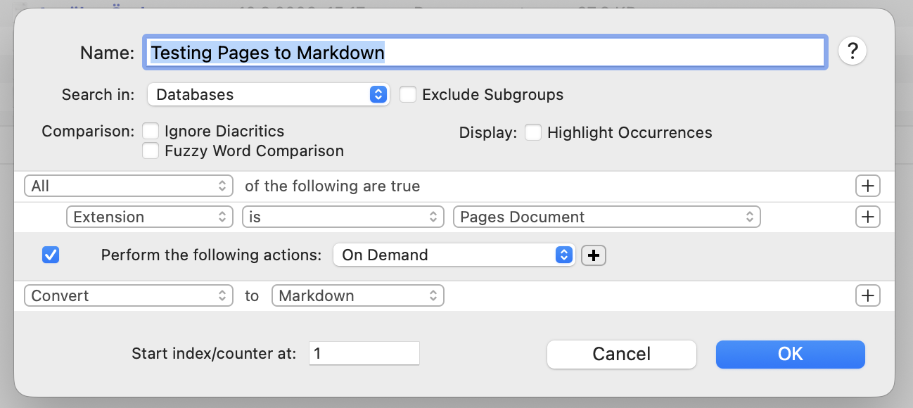 I wish there were a script in DT that would convert Pages documents to Markdown. Ideally, I’d import hundreds of Pages documents into DT and have it convert them to Markdown for import into Ulysses or Finder for use with another Markdown editor.